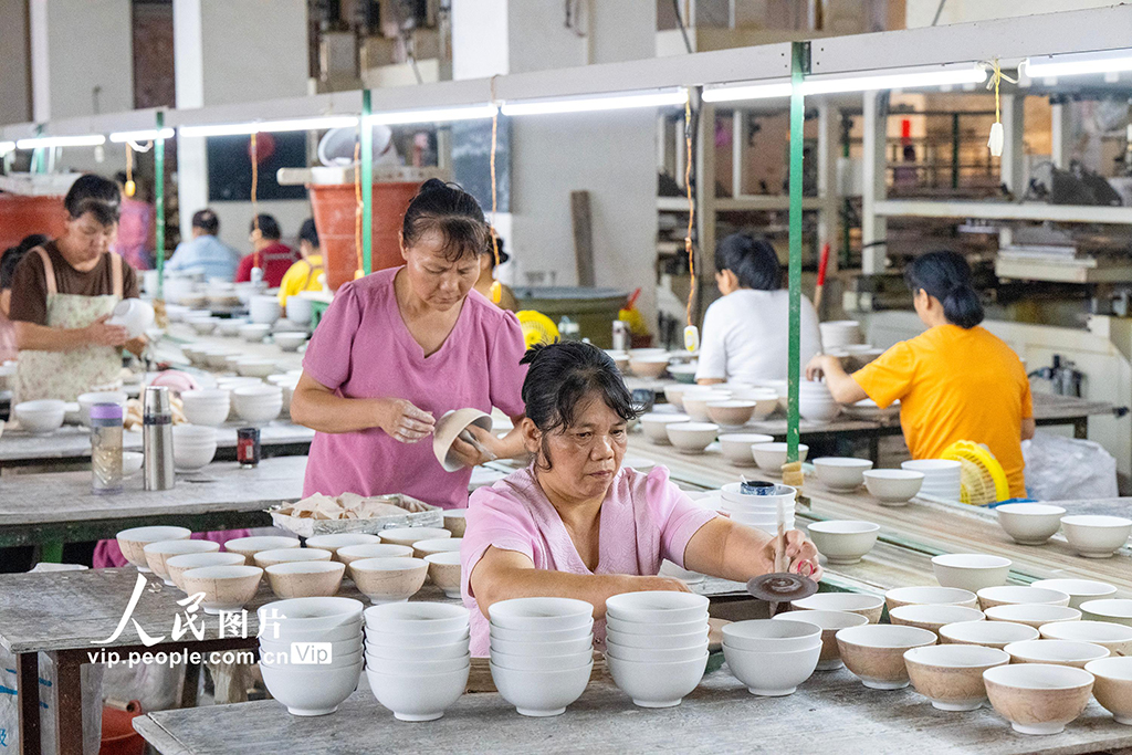 2024年7月22日,在廣西玉林市容縣的南山瓷器有限公司車間里,工人們忙碌地給瓷器畫線、放坯…