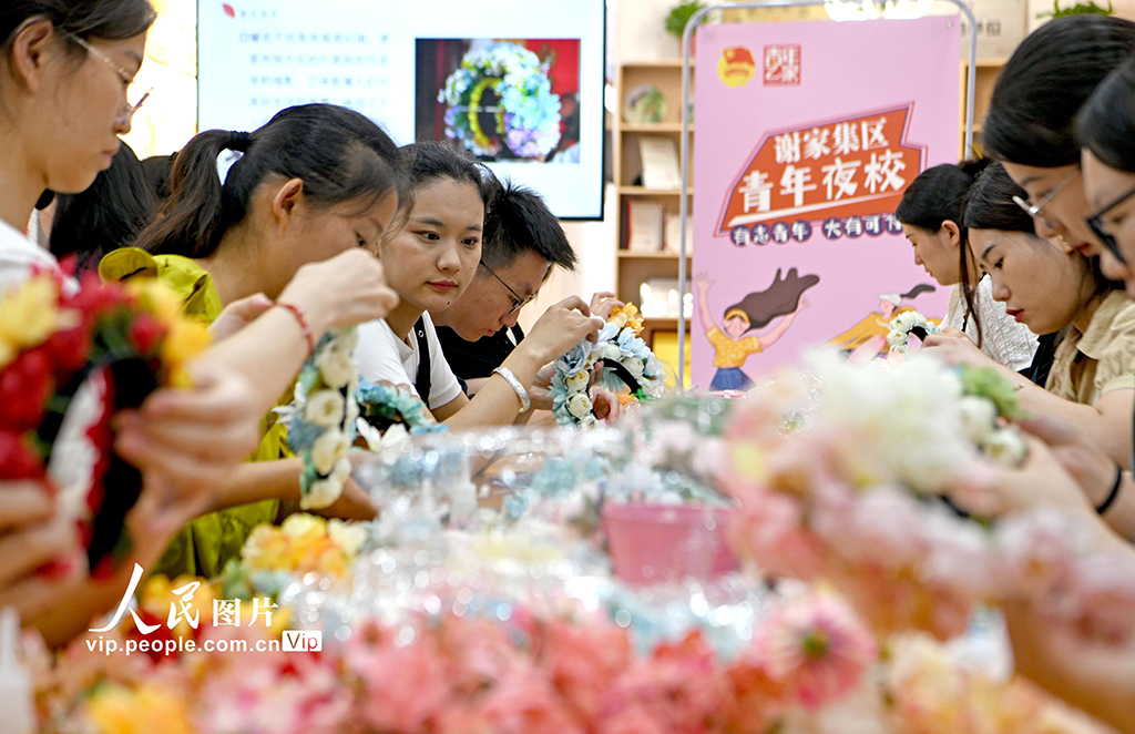 2024年8月8日,安徽省淮南市謝家集區青年下班后在青年夜校里免費學習非遺簪花,豐富業余生活…