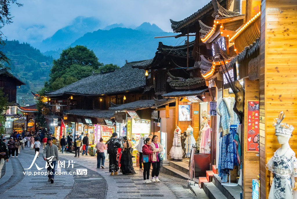 2024年10月15日夜晚,貴州省黔東南苗族侗族自治州雷山縣西江千戶苗寨燈火輝煌,吊腳樓與遠…